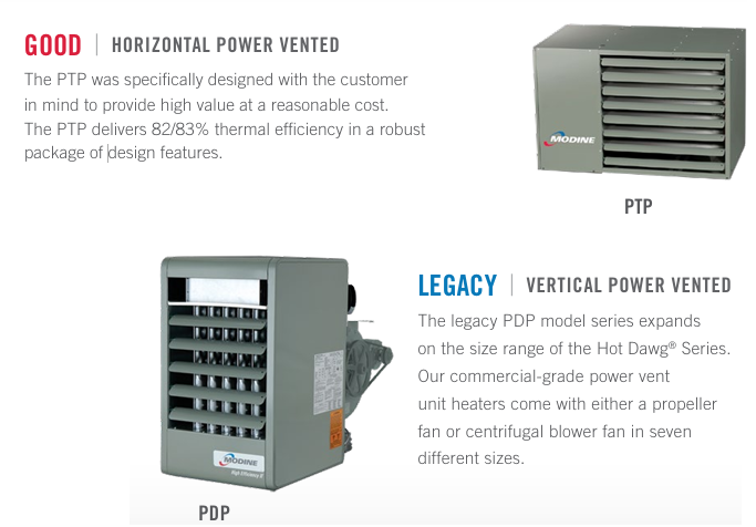 If you are replacing an older unit heater, a clamshell design may be the better option in some cases. These units tend to be smaller and may fit better into the existing footprint without requiring major changes to support systems or ductwork.