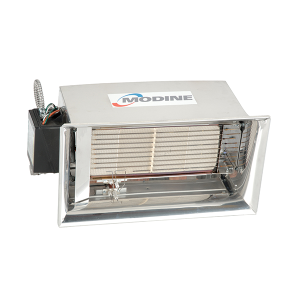 Modine equipment ships with reinforced corner protection and secured mounting to prevent cabinet damage and ensure fan assemblies arrive installation-ready.