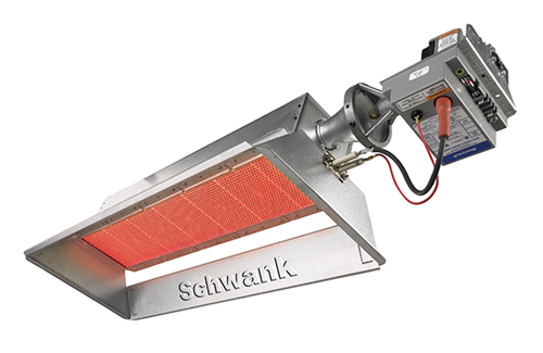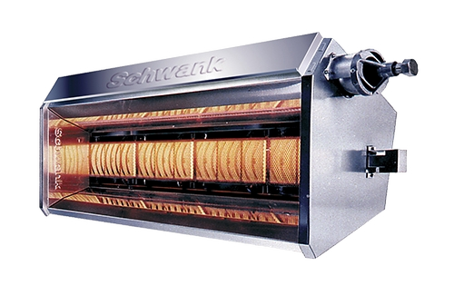 High-intensity infrared heaters designed for commercial/industrial spaces requiring rapid heat-up (2 minutes to full operation). The ecoSchwank series features patented ceramic burners with 52% radiant energy conversion and 35% CO2 reduction.